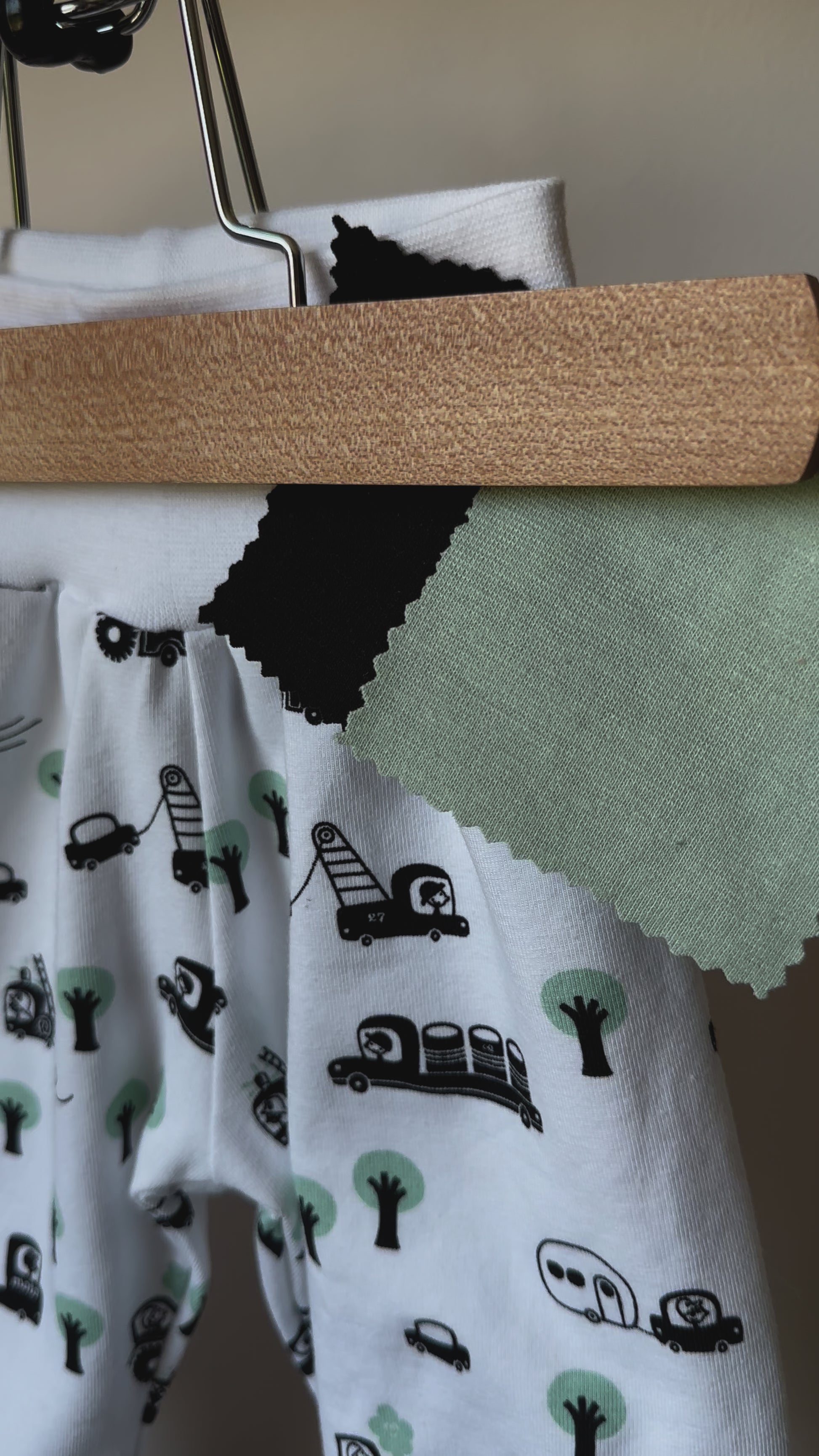 Direction le chantier avec ce motif plein d’énergie ! De jolis camions de chantier noirs sur fond blanc pour tous les petits passionnés de tractopelles, pelleteuses et bétonnières 🚜🛠️
